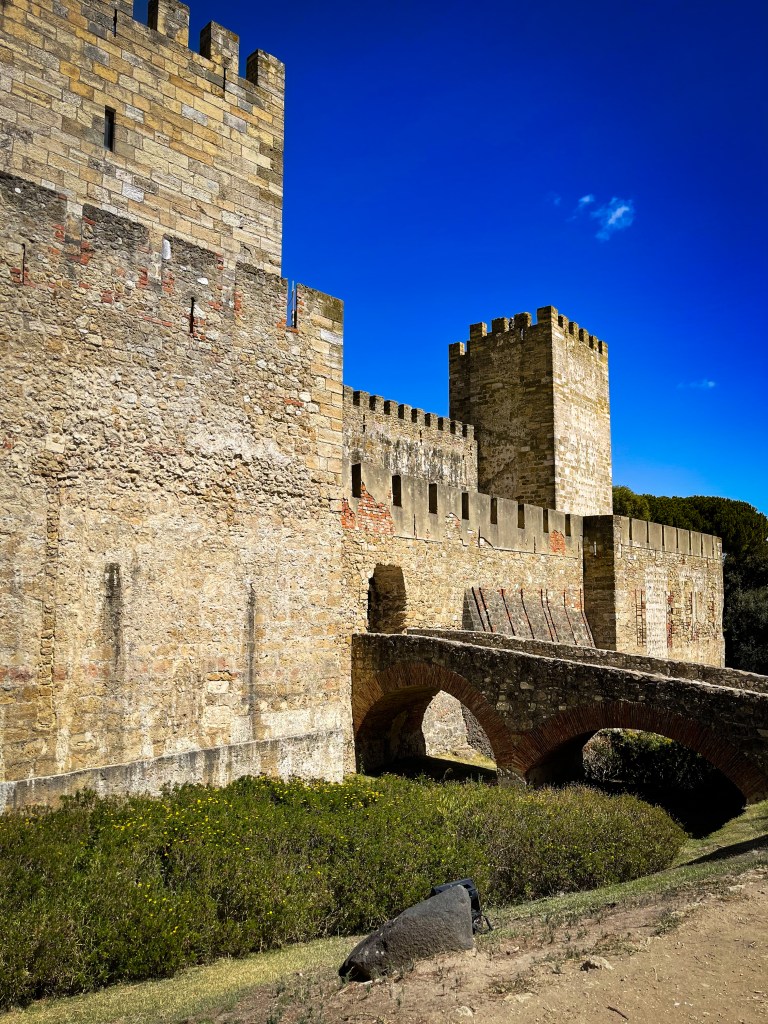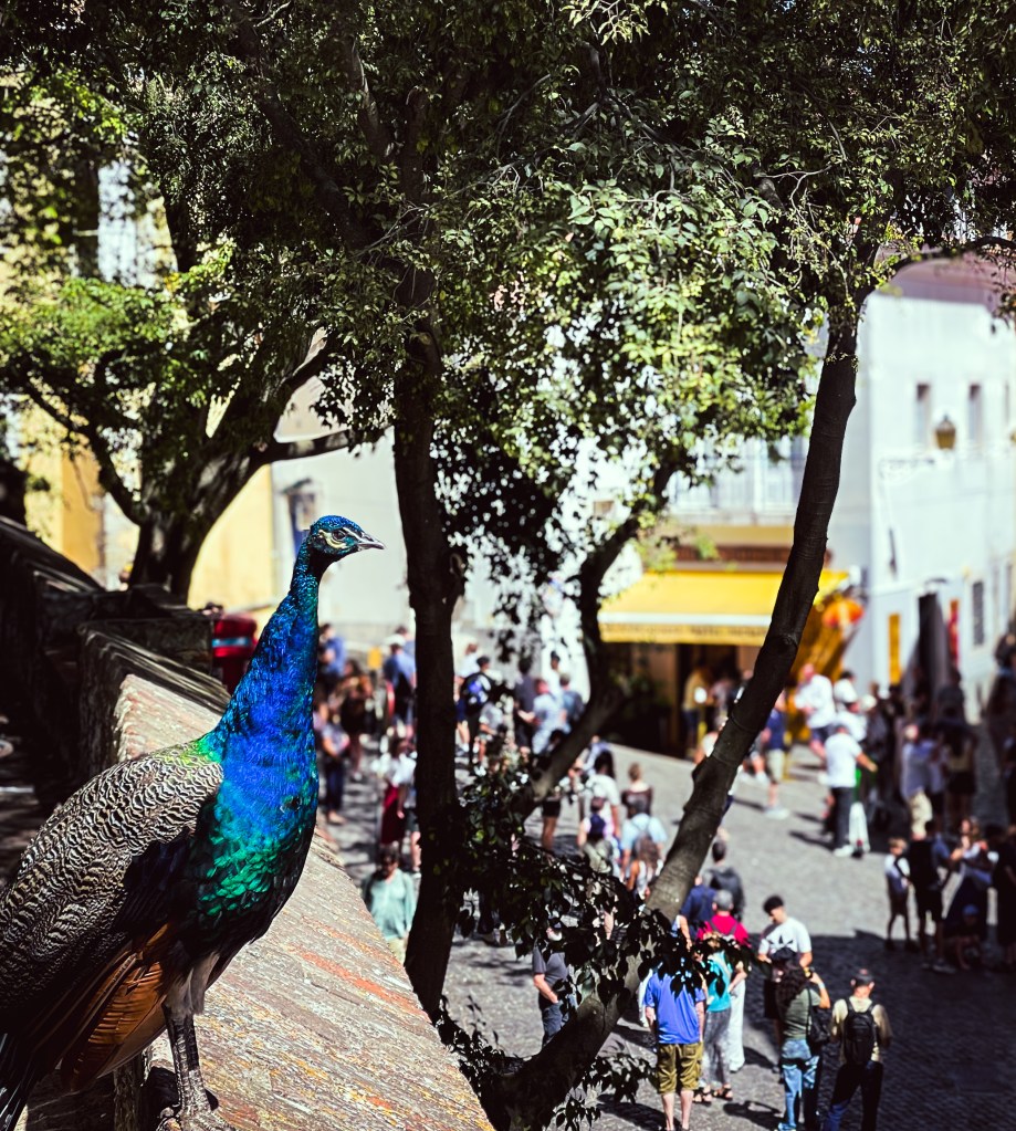 Nous avons ensuite gravi les ruelles escarpées du vieux Lisbonne, pavées et pleines de charme. L’ascension nous a menées jusqu’au château, où un spectacle inattendu nous attendait : des paons majestueux nous ont accueillies à l’entrée, comme les gardiens colorés d’un autre temps. L’entrée coûtait 15 euros, mais la récompense en valait bien plus : une vue imprenable sur le Tage et sur Lisbonne, qui s’étendait jusqu’aux parcs lointains.