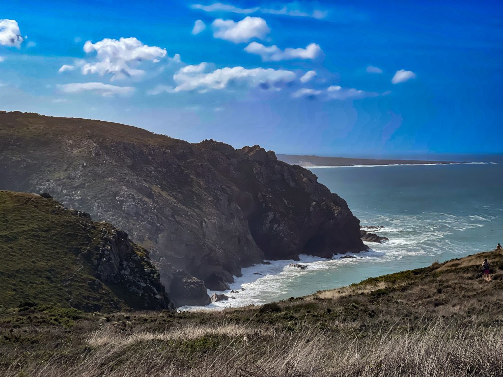 Devant nous, s’étendaient des falaises abruptes, balayées par le vent, plongeant dans l’immensité de l’Atlantique. Le spectacle était presque irréel. Le bleu profond de l’océan se mêlait au vert des collines, et ce contraste donnait l’impression d’être dans un tableau vivant. Nous sommes restés quelques instants en silence, simplement à contempler ce décor à couper le souffle, comme suspendus hors du temps.