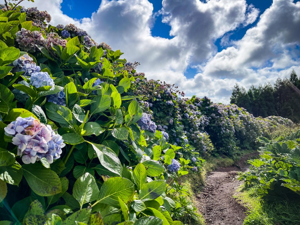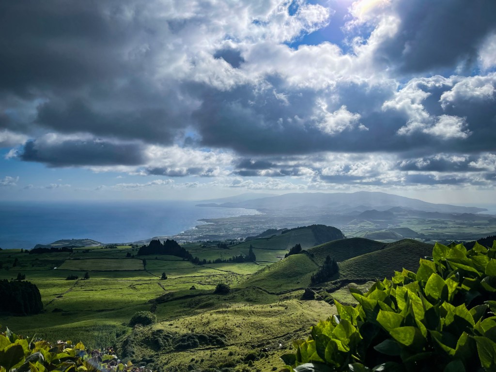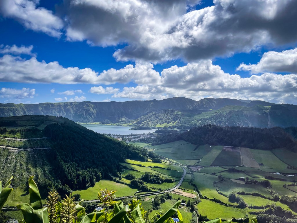 Les routes étroites s’enroulaient autour des montagnes, bordées d’hortensias aux couleurs infinies. Chaque virage ouvrait une nouvelle fenêtre sur un paysage irréel : des vallées verdoyantes, des pâturages où paissent tranquillement les vaches, des collines douces sculptées par le temps. Et puis soudain, le spectacle s’est offert à nous : les lacs de Sete Cidades, lovés dans l’écrin d’un ancien volcan. L’eau miroitait sous le ciel changeant, passant du bleu profond au vert émeraude selon la lumière.